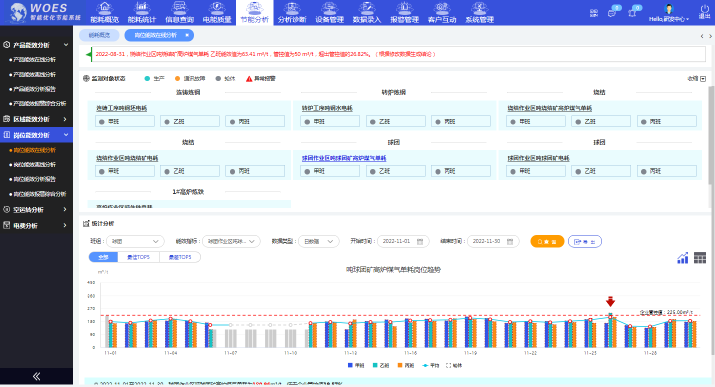 其中岗位能效分析提供时间周期(月、年)内同类产品不同班组的能源消耗分析,并提供对应的能耗走势和分析结论。实现班组用能的数据对比,帮助查找班组间能耗差距;通过对不同班组的能耗进行对比,寻找差异,促进交流学习,提高操作技能。而钢铁公司往往班组众多,班组间操作水平参差不齐,能耗差别很大。