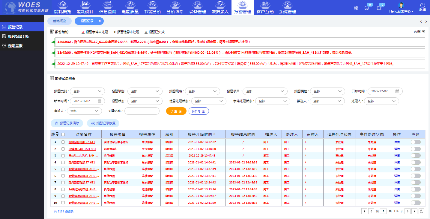 主要是对设置的报警信息进行集中管理,并针对报警信息进行汇总统计分析,分析经常出现问题的故障点、故障次数等,自动生成设备异常管理综合报告。使用报警功能可以对重要的用能设备(烧结冷却风机、变压器等)设置用能参数预警,以帮助用能管理者更好的管理和维护重点用能设备,一方面控制主要用能设备的能耗,另一方面关注关键生产设备的运行状态,避免设备故障造成生产的影响。